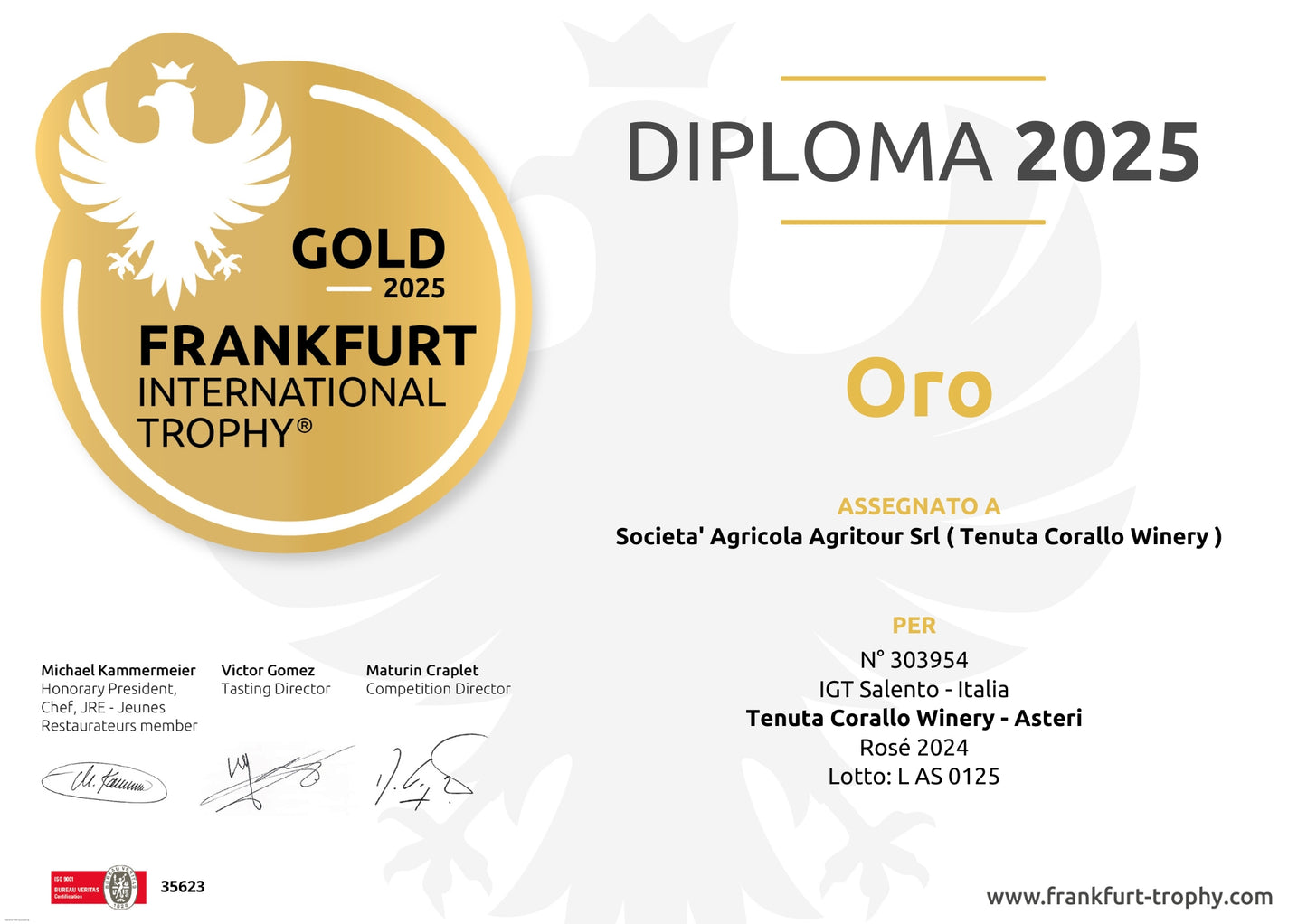 È un rosato composto da sole uve di Primitivo vendemmiate a mano nel corso della prima decade di Settembre che beneficiano della costante presenza dei venti marini che soffiano dal Canale di Otranto.